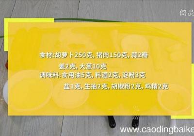 步骤1食材:胡萝卜250克,猪肉150克,蒜2瓣,姜2克,大葱10克 。调味料:食用油5克,料酒2克,淀粉3克,盐1克,生抽2克,胡椒粉2克,鸡精2克 。步骤2胡萝卜切丁 。步骤3蒜对半切开 。步骤4姜切末 。步骤5大葱切末 。步骤6猪肉切...
