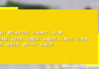 步骤1准备食材:黄瓜皮400克、小米辣5个、蒜3瓣、盐10克、白醋3克、冰糖5克、八角1个、小茴香2克、桂皮2克、香叶1片、花椒1克 。步骤2黄瓜皮洗净 。步骤3切段 。步骤4加盐拌匀 。步骤5腌制30分钟 。步骤6出水后,用清水洗净 。步...