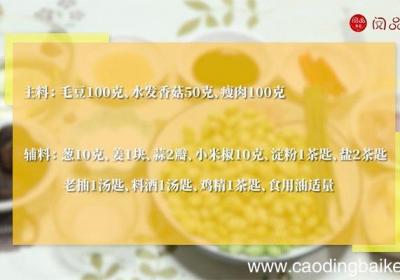 步骤1准备食材:毛豆100克、水发香菇50克、瘦肉100克、葱10克、姜1块、蒜2瓣、小米椒10克、淀粉1茶匙、老抽1汤匙、料酒1汤匙、盐2茶匙、鸡精1茶匙、食用油适量 。步骤2香菇切丁 。步骤3姜切末 。步骤4蒜切末 。步骤5小米椒切圈...
