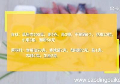 步骤1食材:草鱼肉500克、姜5克、蒜3瓣、干辣椒6个、花椒20粒、小葱3根、面粉50克 。调味料:食用油20克、香辣酱2克、胡椒粉2克、盐1克、鸡精1克、生抽2克 。步骤2草鱼肉放入碗中、加盐、鸡精、胡椒粉、生抽、抓匀、腌制20分钟 。步...