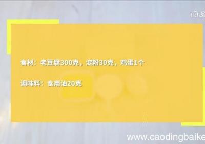 步骤1食材:老豆腐300克,淀粉30克,鸡蛋1个调味料:食用油20克步骤2老豆腐切厚片 。步骤3淀粉中打入鸡蛋,调配成面糊,放入豆腐裹匀 。步骤4、热锅倒油,油温4成热时,下入豆腐,中火慢煎 。步骤5两面煎至金黄即可 。这样煎出来豆腐完整不...