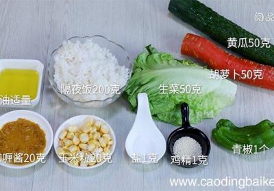 步骤1准备食材:隔夜饭200克、胡萝卜50克、黄瓜50克、生菜50克、青椒1个、玉米粒20克、咖喱酱20克、盐1克、鸡精1克、油适量 。步骤2胡萝卜切丁 。步骤3黄瓜切丁 。步骤4生菜切末 。步骤5青椒去籽切丁 。步骤6锅中放入适量油,油温...