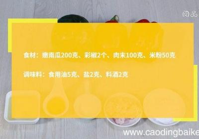 步骤1食材:嫩南瓜200克、彩椒2个、肉末100克、米粉50克 。调味料:食用油5克、盐2克、料酒2克 。步骤2彩椒竖向对半切开,清理干净内瓤 。步骤3嫩南瓜擦细丝 。步骤4热锅倒油,油温5成热时,下肉末,炒散,淋入料酒去腥 。【嫩南瓜酿彩...