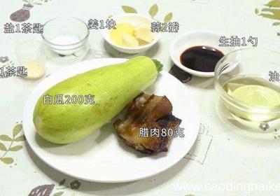 步骤1食材:白瓜200克、腊肉80克、姜1块、蒜2瓣、盐1茶匙、生抽1勺、鸡精1茶匙、油适量 。步骤2姜切片,蒜切末 。步骤3白瓜切片,腊肉切片 。步骤4起锅倒油,下入姜、蒜爆香 。步骤5再下入腊肉片翻炒1分钟 。步骤6再放入白瓜翻炒2分钟...