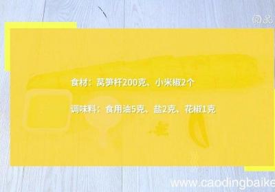 步骤1食材:莴笋杆200克、小米椒2个调味料:食用油5克、盐2克、花椒1克步骤2莴笋去皮,切细丝,放入碗中,加入盐,拌匀,腌制15分钟,挤出水分,装入盘中 。步骤3米椒切小圈,放入莴笋丝盘中 。步骤4热锅倒油,油温4成热 时,下花椒,炒香,...
