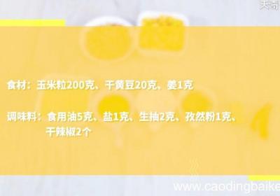 步骤1准备食材:玉米粒200克,干黄豆20克,姜1克、食用油5克,盐1克,生抽2克,孜然粉1克,干辣椒2个 。步骤2干黄豆用清水浸泡12小时 。步骤3倒入锅中,煮20分钟,捞出 。步骤4姜切末 。步骤5干辣椒切段 。步骤6热锅倒油,油温5成...
