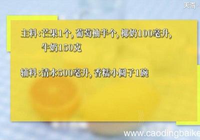 步骤1所需食材:芒果1个,葡萄柚半个,椰奶100毫升,牛奶150克 。所需调料:清水500毫升,香糯小圆子1碗 。步骤2小圆子倒入锅中,加水煮3分钟,捞出放入冰水中浸泡 。步骤3芒果切块,放入搅拌杯中 。步骤4倒入淡奶,打碎成泥 。步骤5将...