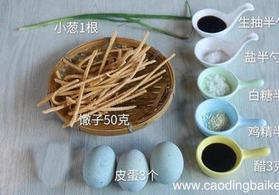 步骤1准备食材:皮蛋3个、馓子50克、小葱1根、生抽半勺、盐半勺、白糖半勺、鸡精半勺、醋3克 。步骤2皮蛋剥去外壳,竖着对半切开,再切小块,装盘备用 。步骤3将馓子掰成小节放在皮蛋上 。步骤4葱切葱花 。步骤5碗中放入盐半勺、鸡精半勺、白糖...