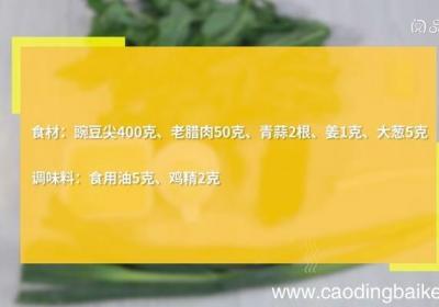 步骤1食材:豌豆尖400克、老腊肉50克、青蒜2根、姜1克、大葱5克 。调味料:食用油5克、鸡精2克 。步骤2青蒜切片 。步骤3姜切末 。步骤4大葱切片 。步骤5老腊肉切片 。步骤6豌豆尖洗净、沥干 。步骤7热锅倒油、油温4成热时、下老腊肉...