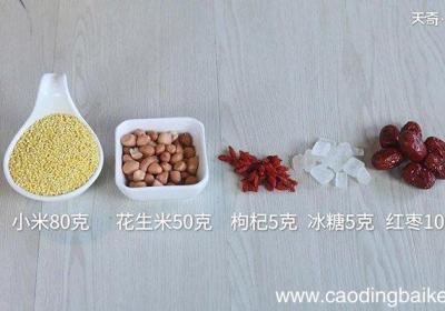 步骤1准备食材:小米80克、红枣10克、枸杞5克、花生米50克、冰糖5克 。步骤2花生米洗净浸泡1小时 。【红枣枸杞花生养生粥的做法 怎么做红枣枸杞花生养生粥】步骤3小米洗净浸泡30分钟 。步骤4锅中放入适量清水烧开,放入小米、花生、红枣,...