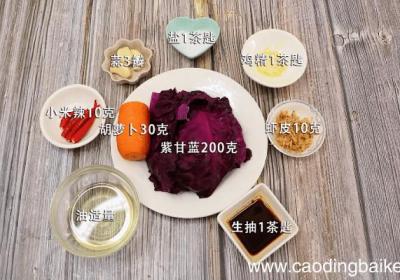 步骤1准备食材:紫甘蓝200克、胡萝卜30克、虾皮10克、小米辣10克、蒜3瓣、盐1茶匙、鸡精1茶匙、油适量、生抽1茶匙 。步骤2紫甘蓝洗净,掰成片 。步骤3胡萝卜去皮切丝 。步骤4小米辣切圈 。步骤5蒜切片 。步骤6首先锅中倒水,烧热,放...
