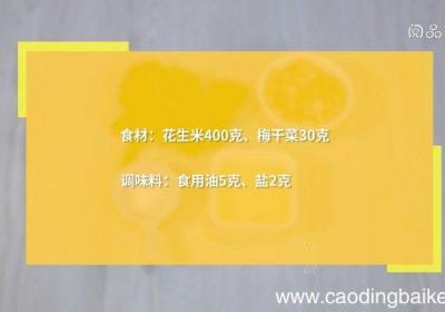 步骤1食材:花生米400克、梅干菜30克 。调料:食用油5克、盐2克 。步骤2梅干菜反复用清水洗净,洗去多余的盐分,挤干水分,切碎 。步骤3花生米用清水浸泡1小时,捞出沥干 。步骤4热锅倒油,油温4成热时,下花生米,小火炒酥,加梅干菜、盐,...