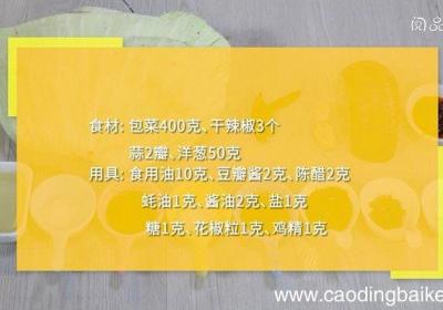 步骤1食材:包菜400克、干辣椒3个、蒜2瓣、洋葱50克 。调味料:食用油10克、豆瓣酱2克、陈醋2克、蚝油1克、酱油2克、盐1克、糖1克、花椒粒1克、鸡精1克 。步骤2包菜洗净,撕小块 。步骤3干辣椒切段 。步骤4大蒜切片 。步骤5洋葱切...