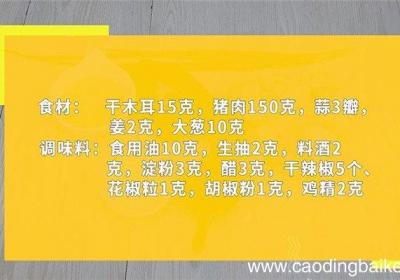 步骤1食材:干木耳15克,猪肉150克,蒜3瓣,姜2克,大葱10克 。调味料:食用油10克,生抽2克,料酒2克,淀粉3克,醋3克,干辣椒5个、花椒粒1克,胡椒粉1克,鸡精2克 。步骤2干木耳用清水浸泡20分钟,木耳切丝 。【酸辣木耳肉丝怎么...