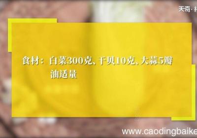 步骤1食材:白菜300克,干贝10克,大蒜5瓣,油适量 。步骤2白菜洗净,撕成小块,放入盘中 。【干贝蒸白菜怎么做 干贝蒸白菜的做法】步骤3蒜切末 。步骤4热锅下油,放入蒜末、干贝炒香 。步骤5盛出,淋在白菜上面 。步骤6放入蒸锅蒸10分钟...