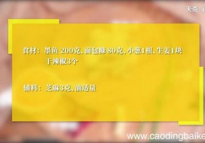 步骤1食材:墨鱼200克,面包糠80克 。辅料:小葱1根,生姜1块,干辣椒3个,盐1茶匙,白芝麻3克 。步骤2墨鱼仔洗净,对半切开 。步骤3小葱切段 。步骤4姜切片 。步骤5干辣椒切段 。步骤6热锅下油,放入切好的墨鱼仔,炸熟后捞出备用 。...