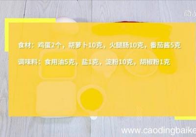 步骤1食材:鸡蛋2个,胡萝卜10克,火腿肠10克,番茄酱5克调味料:食用油5克,盐1克,淀粉10克,胡椒粉1克步骤2胡萝卜切细末 。步骤3火腿肠切细末 。步骤4鸡蛋打散,加入胡萝卜、火腿肠、盐、淀粉、胡椒粉,拌匀 。步骤5热锅倒油,油温6成...