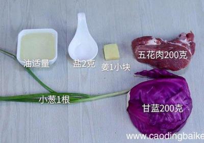 步骤1主料:五花肉200克、甘蓝200克 。辅料:姜1小块、油适量、小葱1根、盐2克 。步骤2将洗净的五花肉切片 。步骤3姜切片,小葱切葱花 。步骤4把甘蓝叶剥掉,切成小块 。步骤5锅中倒油,下姜片翻炒,然后倒入肉片,不断煸炒 。步骤6等到...