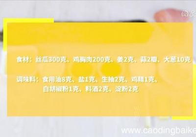 步骤1食材:丝瓜300克、鸡胸肉200克、姜2克、蒜2瓣、大葱10克调味料:食用油8克、盐1克、生抽2克、鸡精1克、白胡椒粉1克、料酒2克、淀粉2克步骤2鸡胸肉切丁 。步骤3加料酒、淀粉,拌匀,腌制15分钟 。步骤4丝瓜去皮,切片 。步骤5...