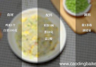 步骤1食材:鸡蛋1个、白菜100克 。配料:米饭1碗、葱10克、蒜2瓣 。辅料:盐1茶匙、油适量 。步骤2白菜切丁 。步骤3葱切成葱花,蒜切末 。步骤4鸡蛋打入碗中打散 。步骤5起锅倒油,油热倒入鸡蛋,放少许盐炒成小块,盛出备用 。步骤6锅...