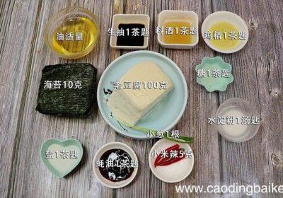 步骤1准备食材:老豆腐100克、海苔10克、小葱1根、油适量、盐1茶匙、生抽1茶匙、蚝油1茶匙、小米辣5克、料酒1茶匙、鸡精1茶匙、糖1茶匙、水淀粉1汤匙 。步骤2老豆腐切片 。步骤3海苔剪碎备用 。步骤4小葱切葱花 。步骤5小米辣切圈 。...