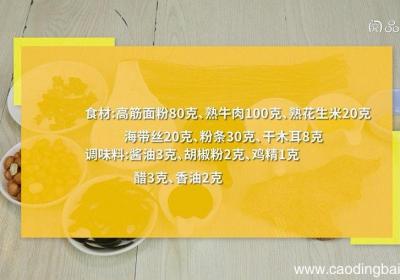 步骤1食材:高筋面粉80克、熟牛肉100克、熟花生米20克、海带丝20克、粉条30克、干木耳8克、酱油3克、胡椒粉2克、鸡精1克、醋3克、香油2克 。步骤2面粉加45克清水揉成面团,放在大碗中,加清水浸泡10分钟,将面团揉洗出面筋,洗面筋水...