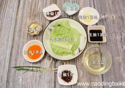 步骤1准备食材:大头菜200克、干辣椒10克、蒜3瓣、盐1茶匙、鸡精1茶匙、生抽1茶匙、红油1茶匙、油适量、花椒5克、小葱1根 。步骤2大头菜洗净掰成小块 。步骤3干辣椒切段 。步骤4【火爆大头菜 火爆大头菜的做法】蒜切末 。步骤5小葱切葱...