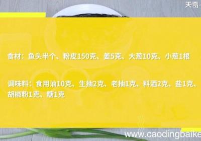 步骤1准备食材:鱼头半个、粉皮150克、姜5克、大葱10克、小葱1根、食用油10克、生抽2克、老抽1克、料酒2克、盐1克、胡椒粉1克、糖1克 。步骤2粉皮切长条 。步骤3小葱切葱花 。步骤4大葱切段 。步骤5姜切片 。步骤6热锅倒油,油温5...