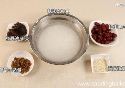 步骤1准备食材:糯米200克、红枣100克、红豆沙50克、芝麻适量、葡萄干适量 。步骤2把事先隔夜泡好的糯米倒入蒸锅里蒸熟 。步骤3再用擀面杖和刮刀压成糯米团 。步骤4红枣去核,放入蒸锅蒸熟透 。步骤5模具四壁涂油,在上面铺一层糯米团 。步...