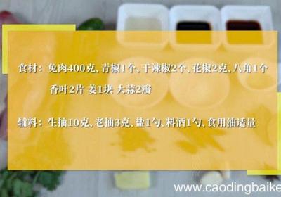 【红烧兔肉的做法 红烧兔肉怎么做】步骤1食材:兔肉400克、青椒1个、干辣椒2个、花椒2克、八角1个、香叶2片、姜1块、大蒜2瓣 。辅料:生抽10克、老抽3克、盐1勺、料酒1勺、食用油适量 。步骤2青椒切块,干辣椒剪成段 。步骤3姜切片,蒜...