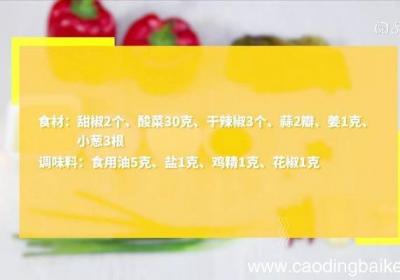 步骤1食材:甜椒2个、酸菜30克、干辣椒3个、蒜2瓣、姜1克、小葱3根调味料:食用油5克、盐1克、鸡精1克、花椒1克步骤2甜椒去蒂,切块 。步骤3酸菜切丝 。步骤4干辣椒切段 。步骤5蒜切末 。步骤6姜切末 。步骤7小葱切段 。步骤8热锅倒...