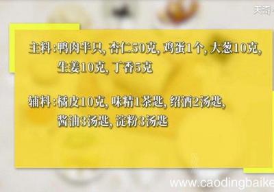 步骤1所需食材:鸭肉半只,杏仁50克,鸡蛋1个,大葱10克,生姜10克,丁香5克 。所需调料:橘皮10克,味精1茶匙,绍酒2汤匙,酱油3汤匙,淀粉3汤匙 。步骤2沸水下鸭肉,焯水捞出 。步骤3鸭肉加入酱油、绍酒、橘皮、丁香、味精、葱末和姜末...