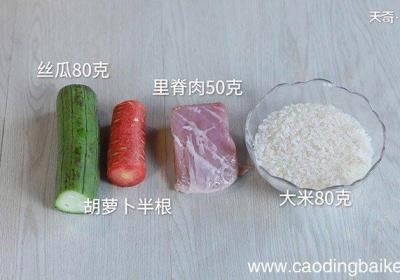 步骤1准备食材:大米80克、丝瓜80克、里脊肉50克、胡萝卜半根 。步骤2大米洗净备用 。步骤3丝瓜去皮洗净切小丁 。步骤4胡萝卜去皮洗净切小丁 。步骤5里脊肉切小丁 。步骤6锅中加入适量水大火烧开,放入大米煮20分钟,期间用勺子不停搅拌,...