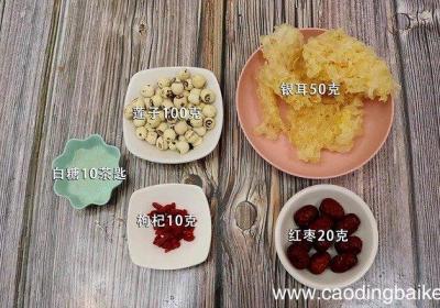 步骤1准备食材:莲子100克、银耳50克、红枣20克、枸杞10克、白糖10茶匙 。步骤2莲子泡水洗净 。步骤3银耳泡水撕小朵 。步骤4红枣切片 。步骤5枸杞洗净备用 。步骤6首先在砂锅中倒入莲子、银耳,再加入适量清水大火煮沸,小火炖煮20分...