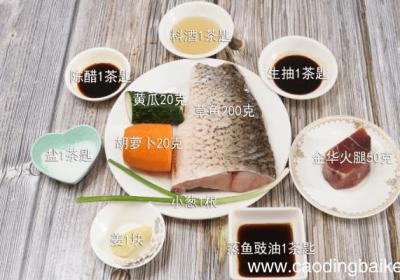 步骤1准备食材:金华火腿50克、草鱼200克、姜1块、黄瓜20克、胡萝卜20克、小葱1根、盐1茶匙、蒸鱼豉油1茶匙、生抽1茶匙、料酒1茶匙、陈醋1茶匙 。步骤2金华火腿切片 。步骤3草鱼洗净去鱼刺,切小块 。步骤4姜切丝 。步骤5黄瓜切丝...