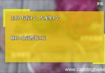 步骤1所需食材:柠檬1个,火龙果1个 。所需调料:盐渍樱花5克 。步骤2火龙果对半切开,取出果肉,切块,放入杯中 。步骤3青柠切块,挤入果肉中 。【樱花气泡水的做法 樱花气泡水怎么做】步骤4放入盐渍樱花,倒入苏打水即可 。...