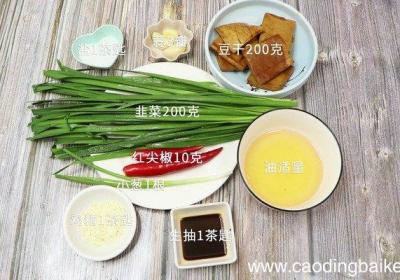 步骤1准备食材:豆干200克、韭菜200克、小葱1根、蒜3瓣、红尖椒10克 。步骤2豆干切条 。步骤3韭菜切小段 。步骤4小葱切葱花 。步骤5蒜切末 。步骤6红尖椒切片 。步骤7首先锅内倒水,水开放入豆干焯水2分钟,捞出备用 。步骤8然后另...