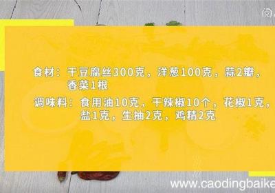 【干豆腐丝儿怎么做 干豆腐丝儿的做法】步骤1食材:干豆腐丝300克,洋葱100克,蒜2瓣,香菜1根 。调味料:食用油10克,干辣椒10个,花椒1克,盐1克,生抽2克,鸡精2克 。步骤2干豆腐丝用沸水烫5分钟,捞出 。步骤3洋葱切细丝 。步骤...