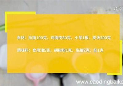 步骤1食材:拉面100克、鸡胸肉80克、小葱1根、高汤200克、食用油5克、胡椒粉1克、生抽2克、盐1克 。步骤2鸡胸肉切丝 。步骤3加入胡椒粉、生抽 。步骤4拌匀腌制10分钟 。步骤5小葱切葱花 。步骤6炒锅中油温5成热时,下入鸡丝炒熟,...
