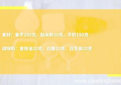 步骤1准备食材:香芋200克、粘米粉50克、牛奶150克、食用油20克、白糖10克、白芝麻20克 。步骤2芋头切块,放入蒸锅,蒸30分钟 。步骤3取出,压成泥,加入牛奶、白糖、粘米粉,拌匀 。步骤4用模具压实 。步骤5取出切条 。步骤6裹上...