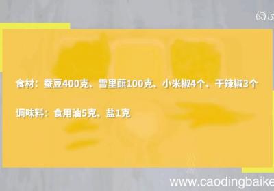 步骤1准备食材:蚕豆400克、雪里蕻100克、小米椒4个、干辣椒3个、食用油5克、盐1克 。步骤2雪菜先浸泡两个小时,中间换两次水清洗,去掉一部分盐分,捞出,挤去水分,切成小段 。步骤3蚕豆洗净,沥干备用 。步骤4小米椒切小段,干辣椒切小段...