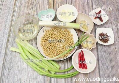 步骤1准备食材:黄豆100克、芹菜100克、油适量、盐1茶匙、鸡精1茶匙、大葱1段、姜1块、蒜3瓣、小米椒5克、花椒5克、干辣椒5克、小葱1根步骤2黄豆用温水侵泡2小时 。步骤3芹菜切丁 。步骤4姜切片 。步骤5大葱切碎 。步骤6蒜切片 。...