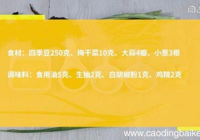 步骤1食材:四季豆250克、梅干菜10克、大蒜4瓣、小葱3根 。调味料:食用油5克、生抽2克、白胡椒粉1克、鸡精2克 。步骤2四季豆洗净,去筋,切断,锅中水沸后,下四季豆,焯水2分钟,沥干备用 。步骤3梅干菜反复用清水洗净,洗去多余的盐分,...