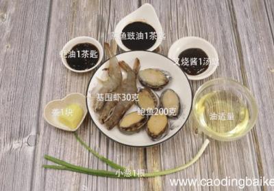 步骤1准备食材:鲍鱼200克、基围虾30克、蒸鱼豉油1茶匙、叉烧酱1汤匙、小葱1根、蚝油1茶匙、姜1块、油适量 。步骤2鲍鱼去壳洗净切花刀 。步骤3小葱切葱花 。步骤4基围虾洗净备用 。步骤5姜切片 。步骤6锅中倒油,油热加入姜片炒香,再加...