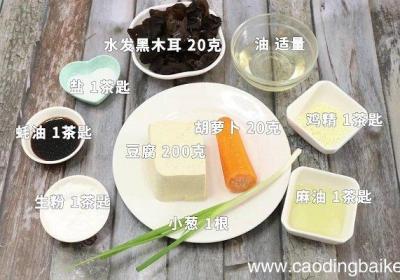 步骤1准备材料:豆腐200克、水发黑木耳20克、盐1茶匙、鸡精1茶匙、蚝油1茶匙、油适量、生粉1茶匙、小葱1根、麻油1茶匙、胡萝卜20克 。步骤2豆腐洗净切小块 。【黑木耳烩豆腐怎么做 黑木耳烩豆腐做法】步骤3黑木耳洗净撕成小朵 。步骤4胡...