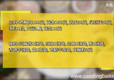步骤1食材:鸡胸肉100克,面条150克,黄瓜50克,绿豆芽50克,葱白1段,大蒜3瓣,花生10克 。调料:芝麻酱1汤匙,红油1汤匙,生抽1汤匙,醋1汤匙,香油半汤匙,盐1茶匙,鸡精半茶匙,花椒粉2克 。步骤2花生捣碎 。步骤3黄瓜切片后改...