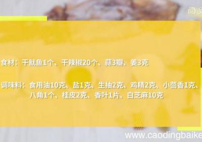 步骤1准备食材:干鱿鱼1个、干辣椒20个、蒜3瓣、姜3克、食用油10克、盐1克、生抽2克、鸡精2克、小茴香1克、八角1个、桂皮2克、香叶1片、白芝麻10克 。步骤2干辣椒切丝 。步骤3蒜切片 。步骤4姜切丝 。步骤5干鱿鱼剪细丝 。步骤6用...