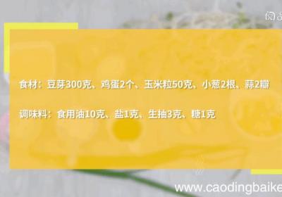 步骤1准备食材:豆芽300克、鸡蛋2个、玉米粒50克、小葱2根、蒜2瓣、食用油10克、盐1克、生抽3克、糖1克 。步骤2豆芽洗净备用 。步骤3鸡蛋打散 。步骤4玉米粒洗净备用 。【玉米豆芽炒鸡蛋的做法,玉米豆芽炒鸡蛋怎么做】步骤5小葱切葱花...