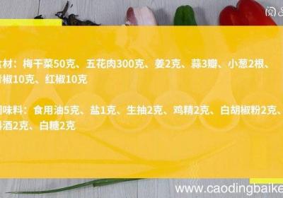 步骤1食材:梅干菜50克、五花肉300克、姜2克、蒜3瓣、小葱2根、青椒10克、红椒10克 。调味料:食用油5克、盐1克、生抽2克、鸡精2克、白胡椒粉2克、料酒2克、白糖2克 。步骤2梅干菜反复用清水洗净,洗去多余的盐分,挤干水分,切碎 。...