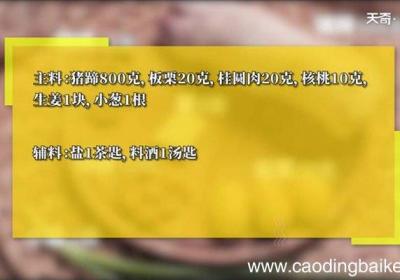 步骤1食材:猪蹄800克,板栗20克,桂圆肉20克,核桃10克,生姜1块,小葱1根 。调料:盐1茶匙,料酒1汤匙 。步骤2猪蹄切块 。步骤3姜切片 。步骤4板栗切块 。步骤5小葱切段 。步骤6锅中加入适量清水,放入猪蹄、料酒,煮2分钟捞出...